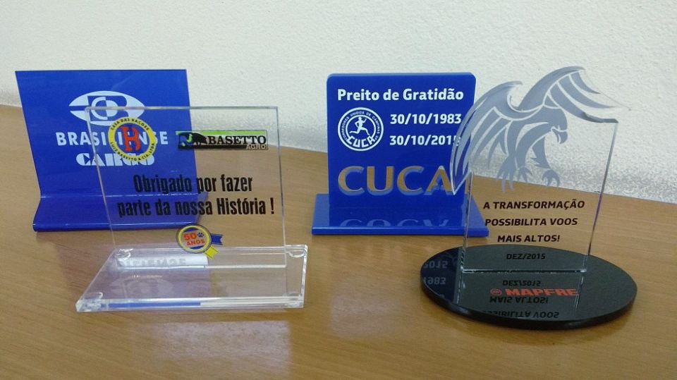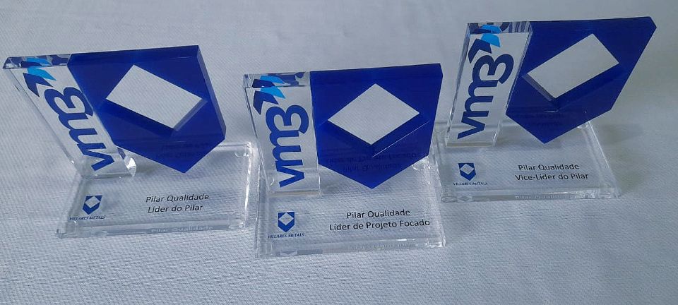 Troféus em Acrílico Preto / Cristal - Tipo Torre + Placa em Aço Escovado / Aço Esmaltado Branco