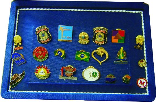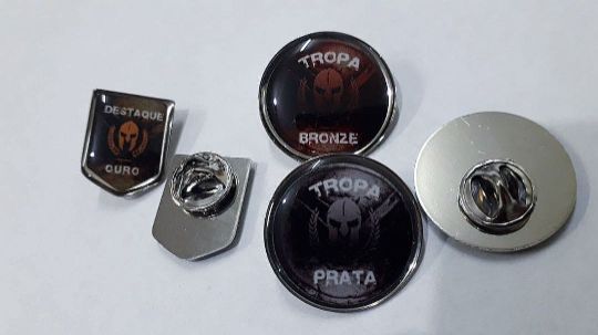 PINS/BROCHES C/BASE EM METAL - FORMATOS PADRÃO (CIRCULAR/RETANGULAR/QUADRADO/OVAL/ESCUDO) - IMPRESSÃO RESINADA