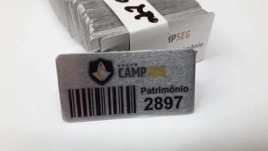 IDENTIFICAÇÃO DE PATRIMÔNIO - PLAQUETA EM ALUMÍNIO - C/NUMERAÇÃO SEQUENCIAL/CÓDIGO DE BARRAS - VERSO ADESIVADO